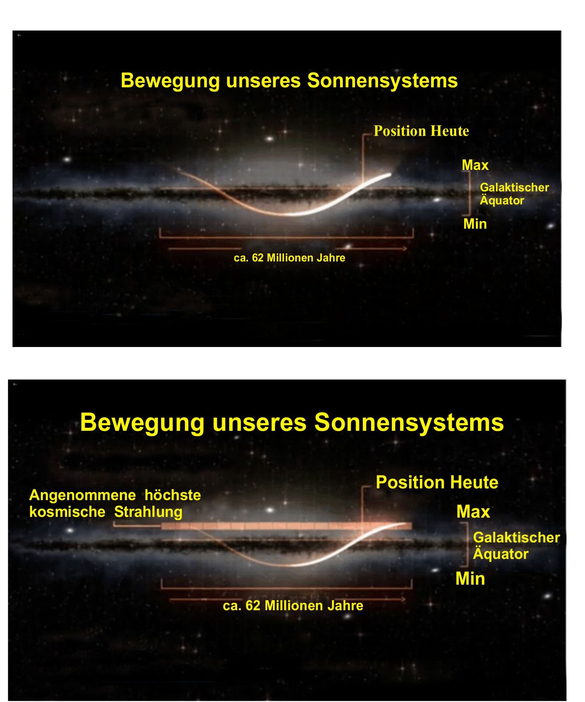Unser Galaktischer Raum bewegt sich wie eine Welle und wir mitten drin bewegen uns in dieser Schwingung mit. So eine Wellenschwingung ist ca. 62 Millionen Jahre einmal um den Galaktischen Äquator.