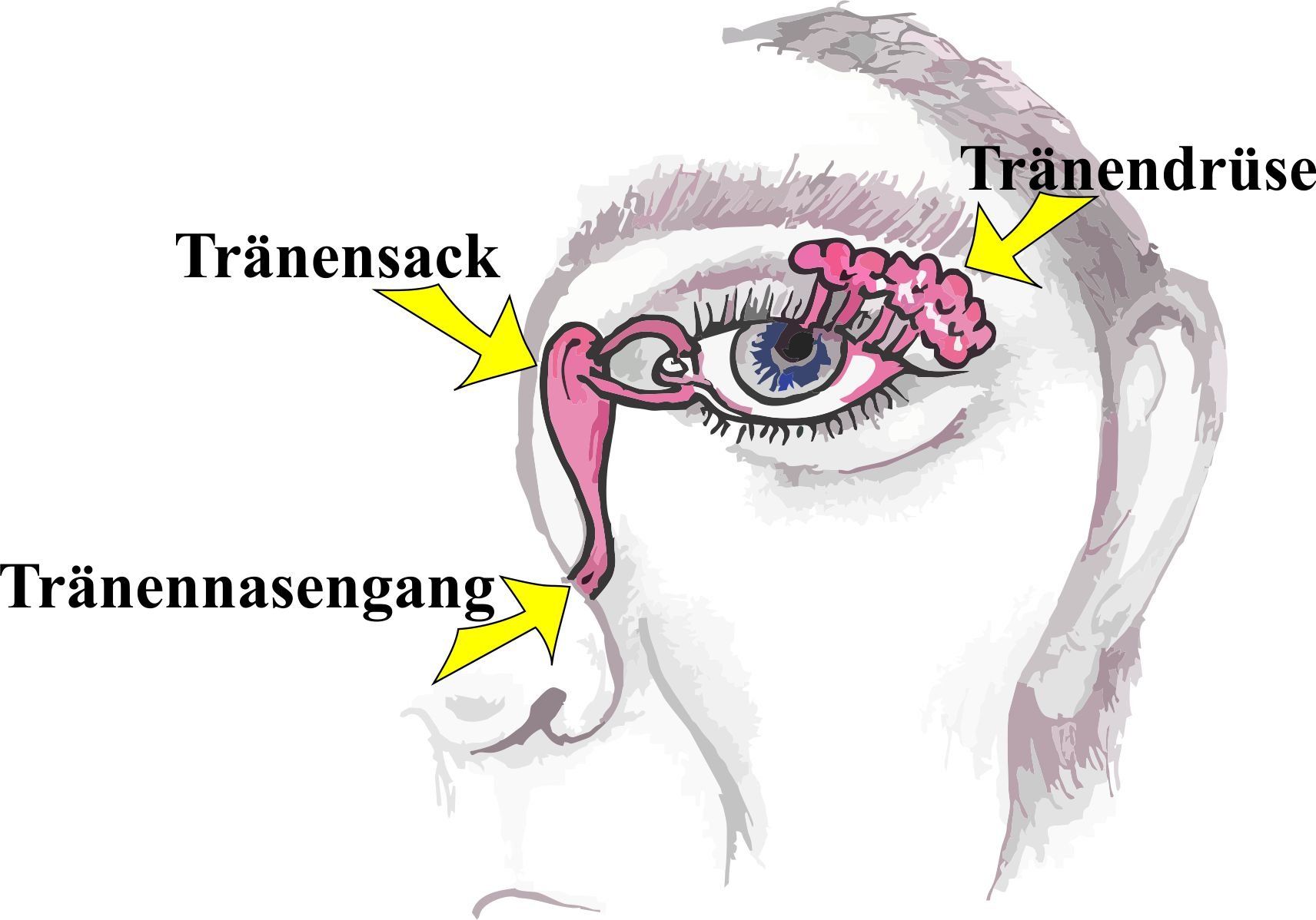 Die überschüssige Flüssigkeit läuft dann über Tränenpünktchen und den Tränenröhrchen in den Tränensack und von dort aus in den Tränennasengang.